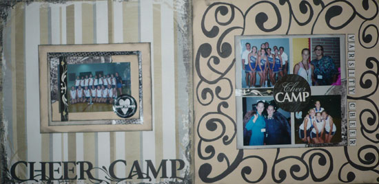- Cut 7” x 5 ½” piece of cream cardstock. Distress edges with black ink. Adhere to Cheer Camp paper.