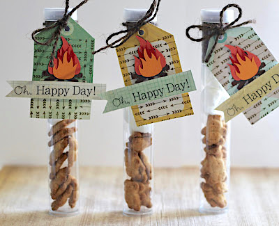 I filled each tube with a little of each ingredient and topped it off with a tag stamped with arrows from the bible background stamp set and a paper pieced campfire, and a little banner of